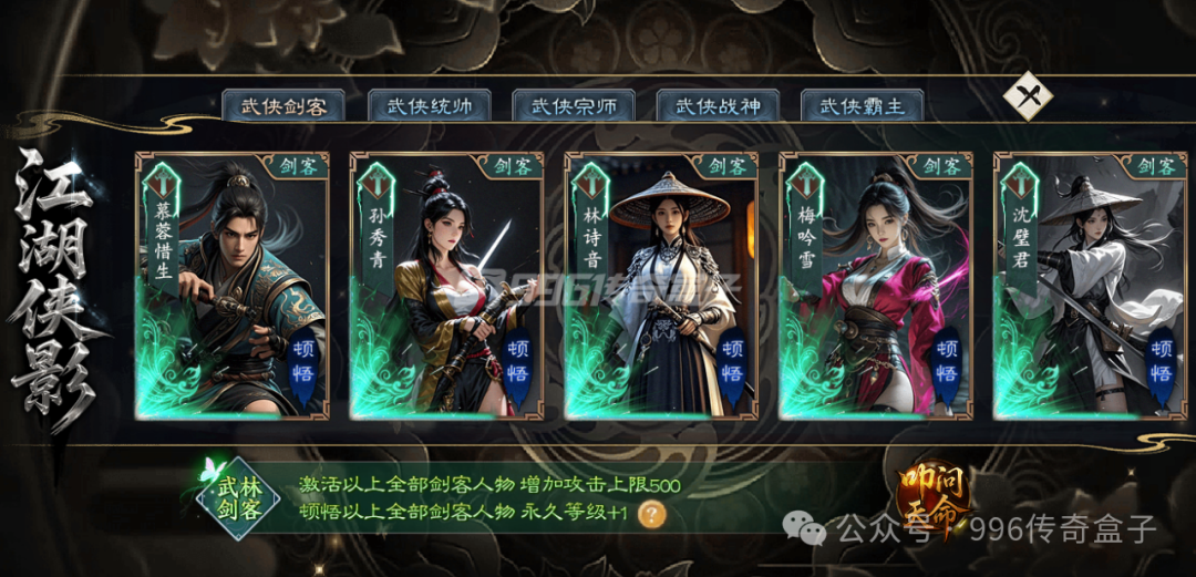 江湖侠影算是这个服的图鉴收集玩法,每个侠客都标注了获得方式,有的完成剧情会送,有的刷怪会掉。每个侠客都有独特属性,全部激活还会获得更多属性相加。激活武林霸主全部侠客,甚至有几率召唤分身作战!170级后,可开启叩问天命玩法,获得顿悟石,用于侠客顿悟,增强属性!