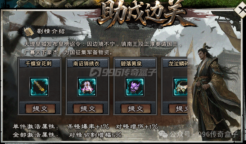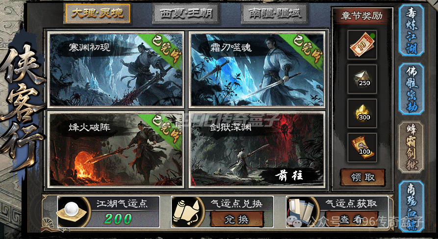 一大陆跟随引导很快会下到二大陆,二大陆会出现侠客行,也就是剧情。这个剧情跟一般的沉默服剧情还是有点不一样的,几乎每个图的每一层都有剧情,玩法也很多样,不是单一的刷怪或者提交专属。四个剧情为一章,每章节的剧情完成后,都会获得累充奖励和江湖气运点,气运点可以兑换充值券和别的重要材料!