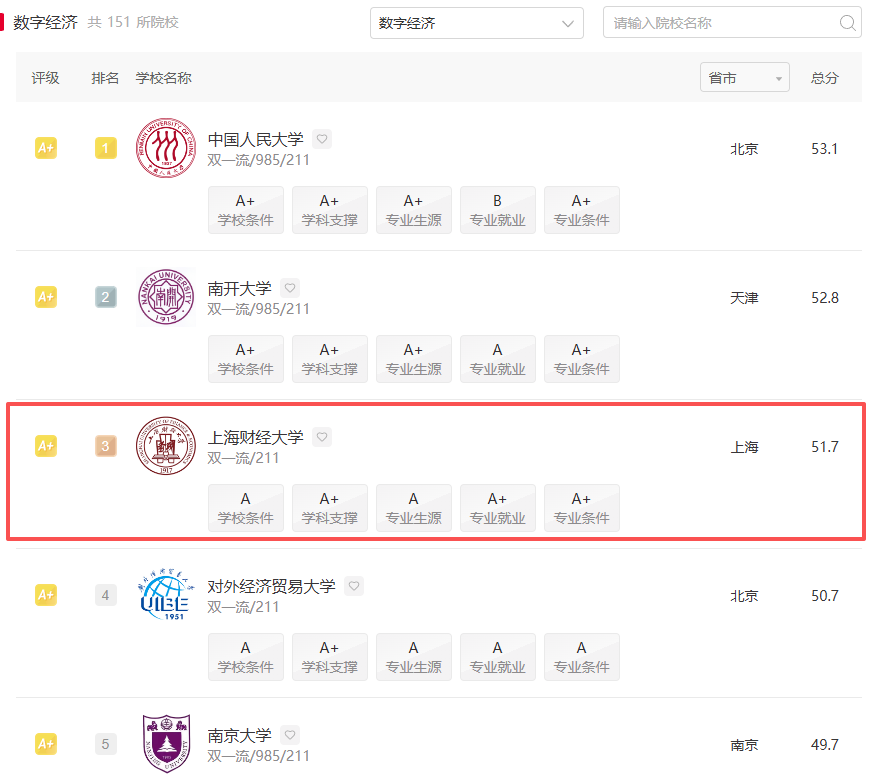 在不确定性加剧的时代,尤其是当一个新兴赛道出现时,谁能率先在这个赛道上插上“顶级”的旗帜,谁就是下一个时代的“版本答案”。在2025年软科中国大学专业排名这份被誉为中国高等教育“体检表”的榜单中,一个现象级的数据引起了许多人的注意:上海财经大学的数字经济专业,首次参评,便直接斩获“A+”评级,位列全国第三,更是上海地区唯一获此殊荣的高校。