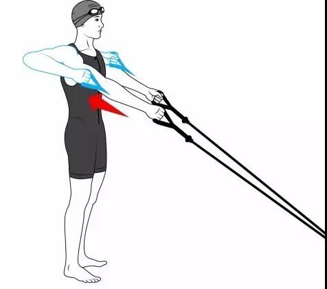 同样把弹力绳固定在跟腹部水平的位置,身体背向固定点,双脚采用比肩更宽的站立姿势,双手同时往外伸展到肩膀的高度并握好把手。将弹力绳同时往身体前方拉,直到两个拳头碰到为止,要注意手肘在过程中需要维持一定的弯曲,动作持续20秒后休息,再进行下一组。