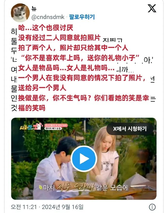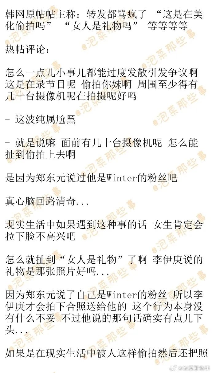 有韩网友还直接发帖嘲讽“李伊庚未经当事人同意拍摄照片&发言引发争议”,并表示相关内容转发都骂疯了,“这是在美化偷拍吗” “女人是礼物吗” 等等言论数不胜数。