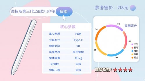 其最大优势在于高度还原Apple Pencil的使用感受:搭载高灵敏度触控芯片,实现低延迟、无断触的流畅书写;配合全屏防误触技术,用户可将手掌自然 放置于屏幕,获得接近真实纸笔的书写沉浸感。同时支持倾斜压感功能,能根据笔杆角度动态调节线条粗细与明暗,满足素描、速写等多样化绘画需求。此外,产品采用与官方Pencil同源的可替换POM笔尖,兼顾顺滑手感与耐磨性,并提供长达30小时的综合续航(含充电仓),实用性极强。正因如此,众多专业数码媒体和测评博主将其称为“百元电容笔中体验与性价比的双重王者”。