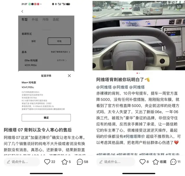 踏入11月,更多车主在社交平台吐槽被阿维塔的“降价增配”背刺,比如提车阿维塔06还不到半月,品牌方就降价;阿维塔06一年换三代,存在明显的“降价增配”操作。
