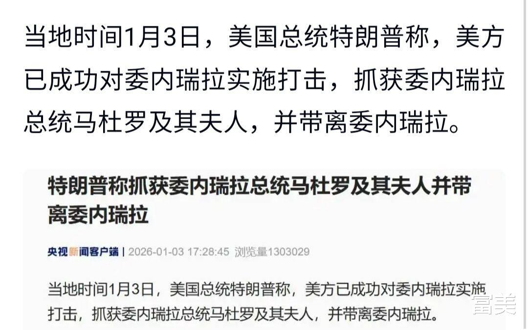 特朗普称抓获委内瑞拉总统马杜罗及其夫人并带离委内瑞拉 当地时间1月3日,美国总统特朗普称,美国已成功对委内瑞拉实施打击,抓走委内瑞拉总统马杜罗及其夫人,并带走委内瑞拉。
