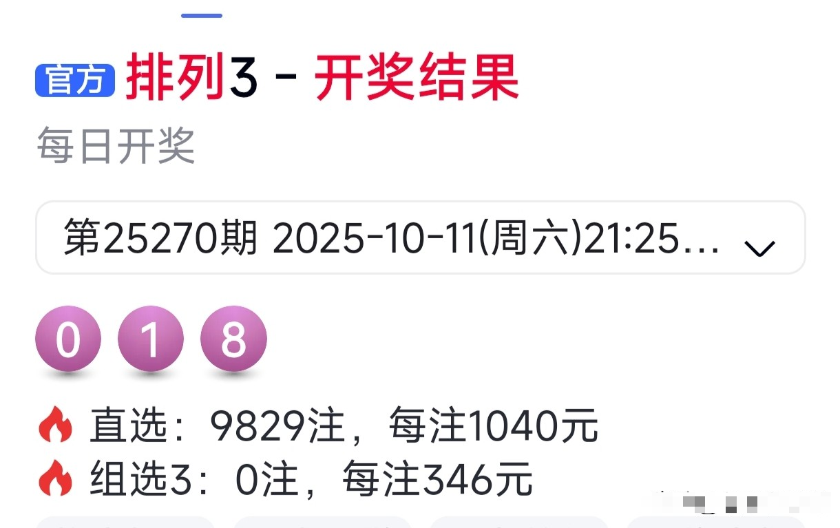排列三25270期开奖号码为:0 1 8