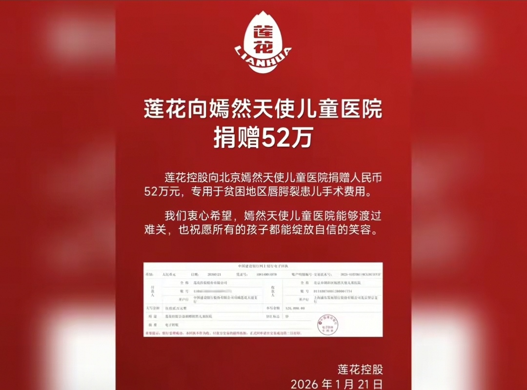 最近,一则看似不起眼的捐赠消息,却让无数网友破防——那个被传“穷得只剩一栋楼”的莲花味精,竟然默默向嫣然天使儿童医院捐出了52万元!