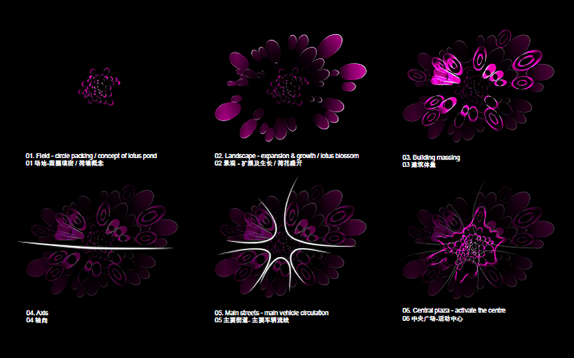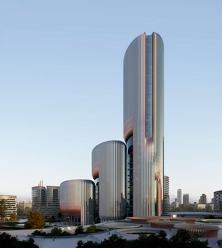 扎哈事务所的方案灵感来源于细胞团簇与自然生长,25栋圆弧建筑如花瓣般环绕排列,形似绽放的莲花,寓意创新企业生机勃发。这一概念允许多变、灵活、富有生命力,可以适应很多不同的需求。同时,对未来的扩张有非常灵活的控制。