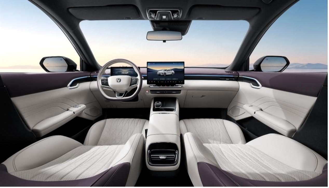 内饰方面,第四代逸动配备了由 14.6 英寸中控屏和 10.25 英寸仪表组成的天枢云境智慧双屏,支持三指飞屏操作。内置天枢 OS 系统,全系标配 AI 大模型语音接入 DeepSeek,可实现自由对话和智能问答。同时,支持 CarPlay、HUAWEI HiCar、Carlink、荣耀互联、小桐互联等多种智能互联方式,并根据不同配置提供 50W 无线快充、256 色氛围灯、8 扬声器等。内饰配色提供金曜黑、紫砚白、神秘红三款双拼色供消费者选择。