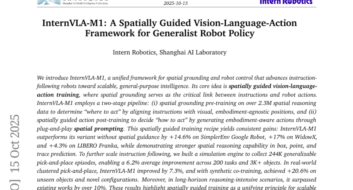 这项由上海人工智能实验室Intern Robotics团队发表于2025年10月15日的研究,提出了一个名为InternVLA-M1的统一视觉-语言-动作框架。有兴趣深入了解的读者可以通过论文编号arXiv:2510.13778v1查询完整论文。