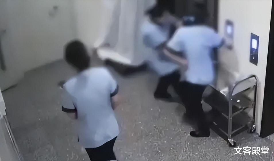 请注意,画面中出现三名的酒店女服务员,正在躲避一男顾客的骚扰,结果不曾想,男人猛踹电梯门之后,竟然从电梯井高空坠落,摔了个血肉模糊。