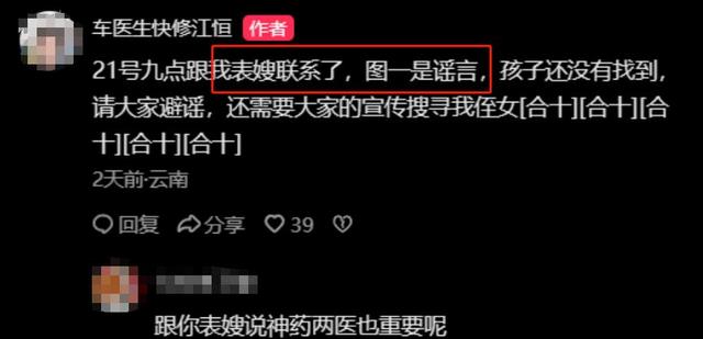 就在大家心急如焚之际,网络上突然出来一批账号称潇潇已经找到了,可还不等大家高兴潇潇的亲人就出来发声了,对方称已经和他表嫂(潇潇妈妈)联系了,孩子还没找到,网上说找到的都是谣言。