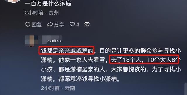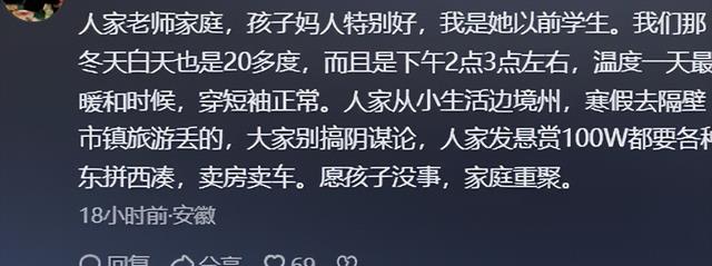 还有一个自称是潇潇妈妈学生的网友表示,下午两三点正是一天最暖和的时候,潇潇穿短袖也很正常,大家就不要阴谋论了,再说了人家悬赏的100万都是东拼西凑、卖房卖车的,目的就是为了赶紧找到孩子。