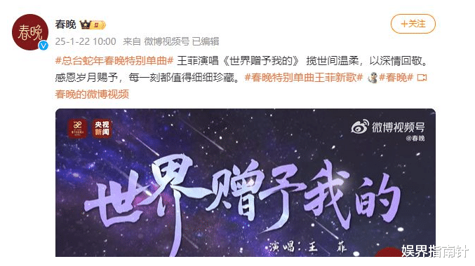 2025 年 1 月 22 日,总台春晚正式官宣,华语乐坛天后王菲将惊喜亮相蛇年春晚舞台,为全球观众深情演绎特别单曲《世界赠予我的》。此消息一出,瞬间在网络上掀起热议,歌迷们纷纷表达对王菲时隔多年再次登上春晚舞台的期待。