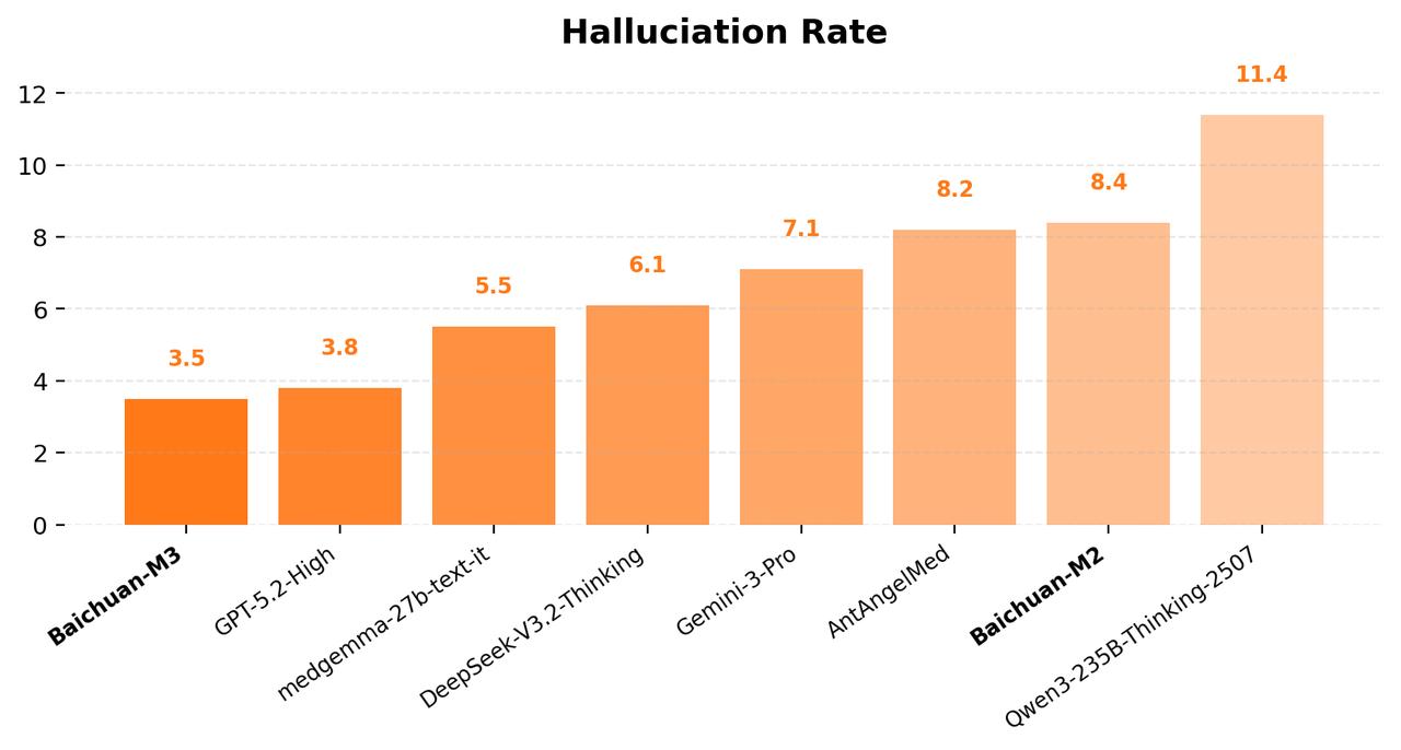 通过将事实一致性约束融入训练流程,M3重构了幻觉抑制的训练范式,在不依赖工具或检索增强的纯模型设置下,医疗幻觉率3.5,超越GPT-5.2,达到全球最低水平。