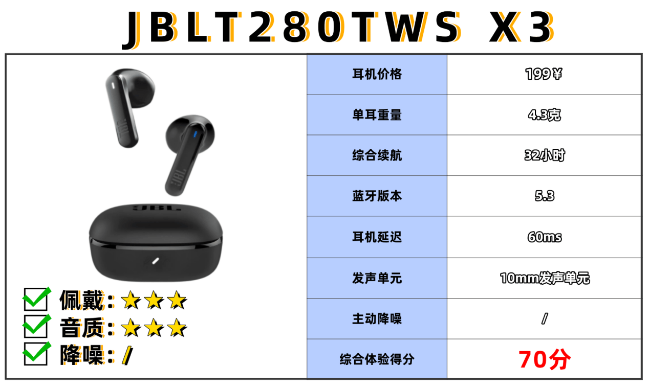 音质方面,耳机配备 12mm 动圈驱动单元,凭借 JBL 在声学技术上的深厚积淀,展现出独特的音质风格,低频表现尤为突出,延续了 JBL 经典的强劲低音,量感十足并具备较深的下潜能力,但由于不具备主动降噪功能,人声的清晰度相比其他同类产品略显平淡。