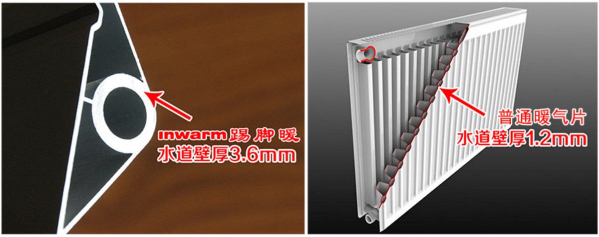 银屋踢脚暖水道短、无焊接点,阻力小,铝合金材质不易透氧,不易滋生细菌和存积污垢,正常使用无需特殊维护。外表面光滑,灰尘易清理。即便出现故障,只需打开装饰罩即可检修,无需破坏墙面地面,某一段损坏仅需更换该段,无需整体更换。其水道壁厚达2.5-3.6 毫米,是普通暖气片的2-3倍,搭配优质黄铜配件,水质符合要求时可终身使用。