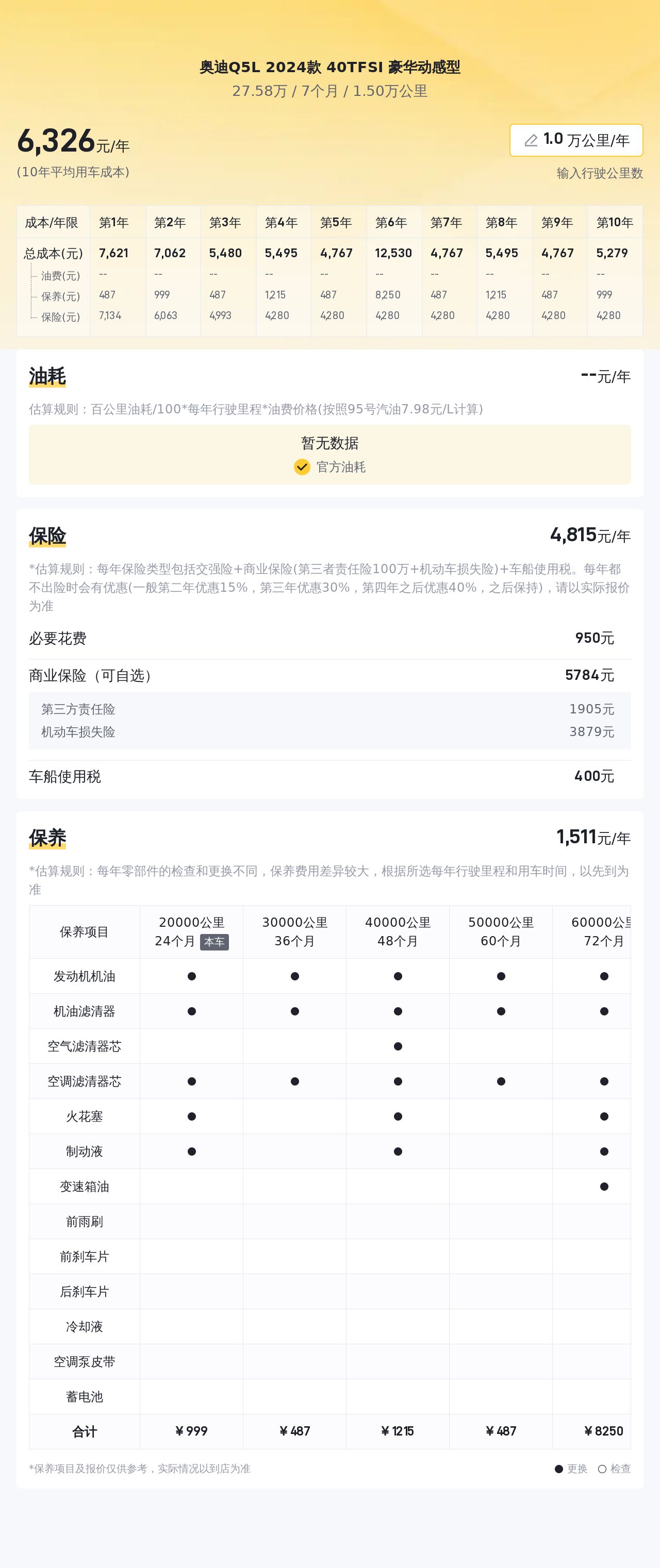 接下来,我们为您计算了该车10年的平均用车成本,帮助您更加全面地了解这台二手车的使用成本。