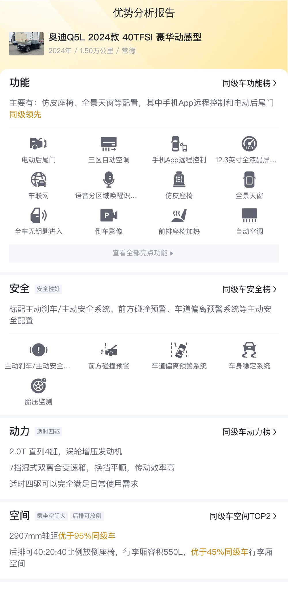 这台奥迪Q5L 2024款 40TFSI 豪华动感型的上牌地为湖南常德,上牌日期2024年6月,表显里程1.5万公里,新车指导价42.08万,二手车报价27.58万,过户次数1次。支持分期购车,首付8.3万即可开回家。