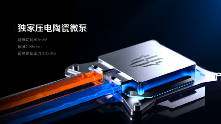 同时通过上千次组合测试,红魔成功带来了独家压电陶瓷微泵,实现了0.85mm的超薄体积和80mW的超低功耗。为了保证流道内液态的高效流通,红魔还在微泵内植入了一颗超低压转化驱动IC,能够将电压从3V转化到150V,保证了100kPa的超高输出压力,让微泵能够高效驱动管道内液体流动,提升手机散热效率。