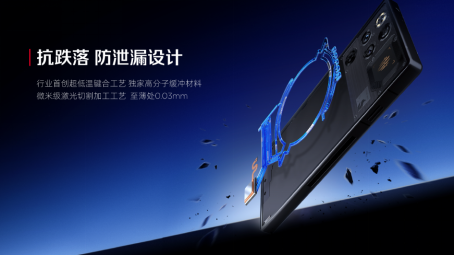 为了保证水冷散热系统的抗跌落能力,防止水冷液泄漏,红魔还行业首创了超低温键合工艺,采用独家高分子缓冲材料,让液体流道在面对不同场景时也能保证不泄漏,日常用机的安全可靠性大幅提升。