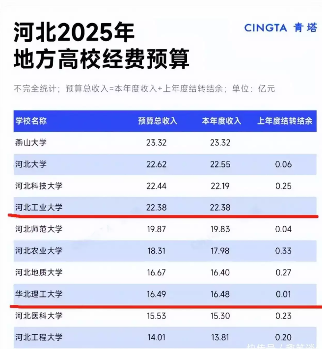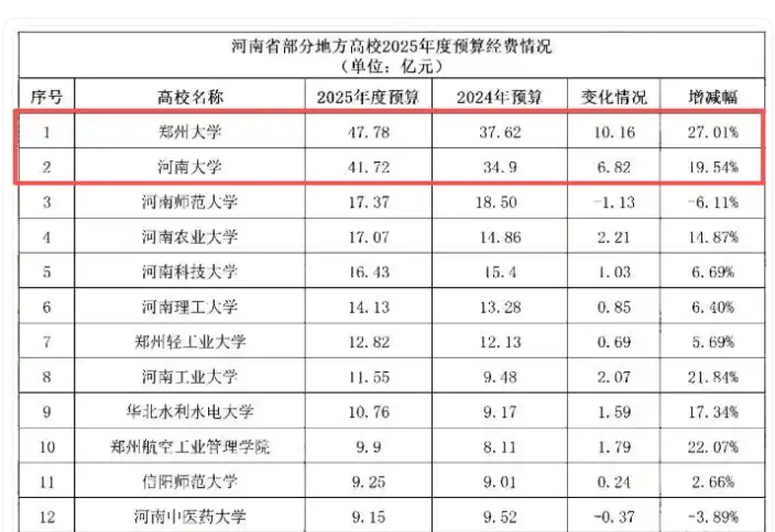 在说起高校建设上,其实大家总会拿河南河北作比较,譬如卷高考难度,两个省份异曲同工。而在高校建设上其实河南还是略胜河北一筹的。毕竟河南有211高校郑州大学,也有双一流高校河南大学。而河北呢?唯一的211高校河北工业大学还位于天津,不尴不尬。从省内投入资金就能看出来,别的省份的985、211资金投入都是独一档的,如河南的郑州大学2025年预算是47.78亿,河南大学是41.72亿。而河北的几个高校河北工业大学、河北大学、燕山大学、河北师范大学每年投入的资金都很均衡,基本都是22亿左右。
