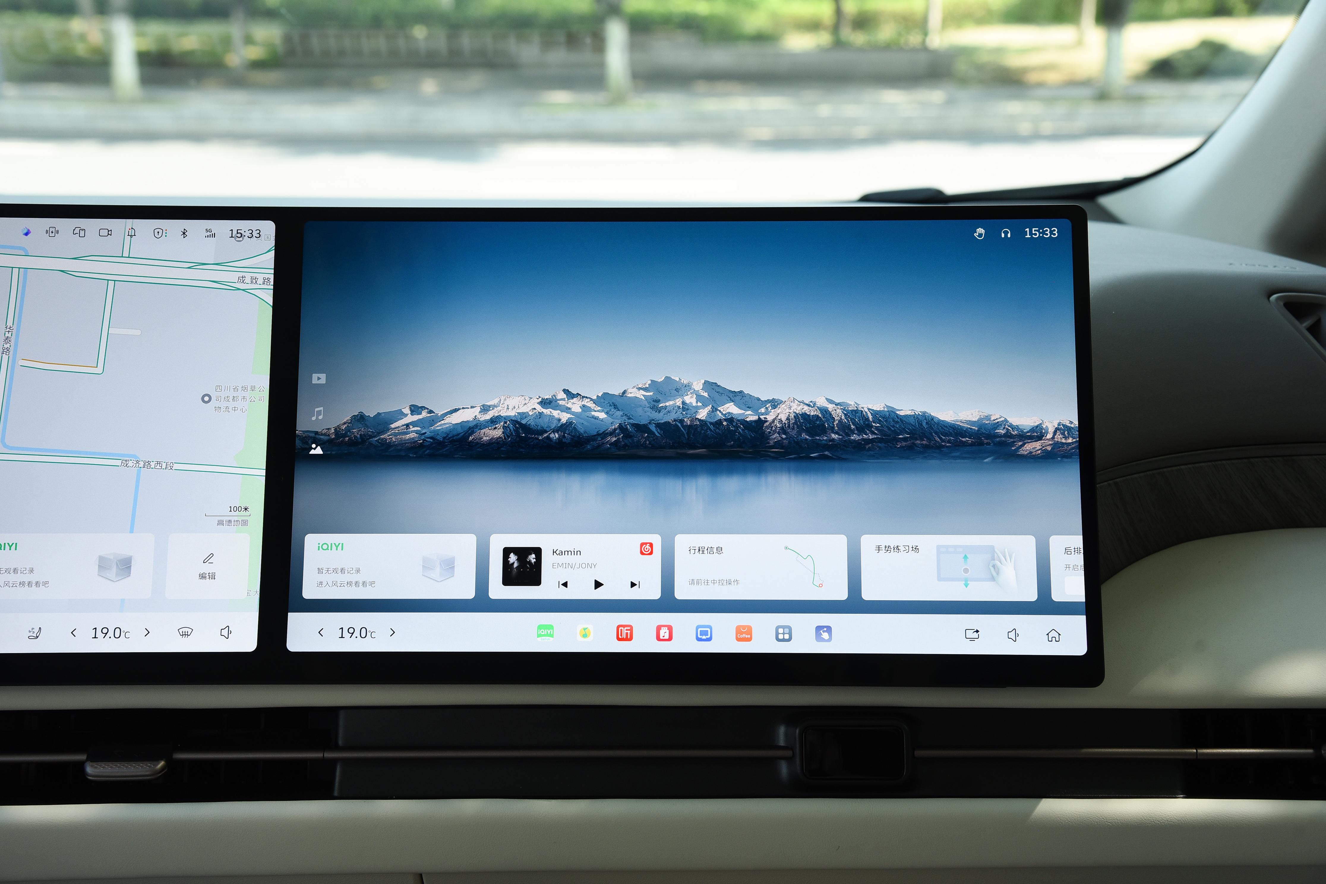 坐进高山7的车内后,整个车内的用料及做工呈现出不错的视觉效果,车内采用了大面积的软质材质以及木质纹理饰板,同时配合精致缝线工艺让车内更显豪华感。双辐式多功能方向盘采用了皮质包裹,支持加热功能,整体握感上较为舒适。同时车内采用了贯穿式的空调出风口设计,很好的拉长了车内宽度。而方向盘前方则是设计了12.3英寸2K全液晶仪表,配合26英寸的抬头显示系统更好的掌握车辆的动态信息。