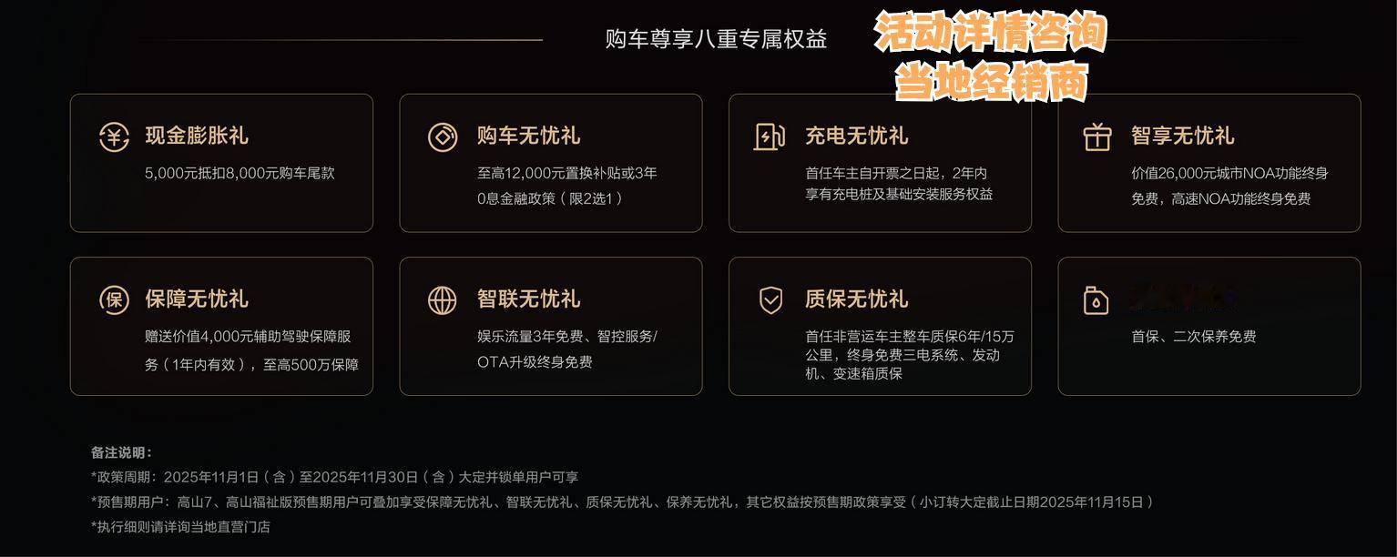 魏牌高山7的官方指导价为28.58万元,目前该车可享受5000抵扣8000元购车尾款、至高12000元置换补贴或3年0息金融政策、2年内享家充电桩安装、价值26000元的城市及高速NOA功能终身免费等八重上市权益(活动详情可咨询当地经销商),从而让该车的性价比进一步提升。