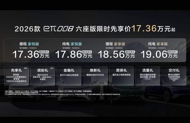 奕起热爱,派生精彩。8月1日,东风奕派汽车科技公司战略发布会暨新车发布会在武汉隆重举行,2026款东风奕派eπ008六座版焕新上市。新车在“舒心品质、舒心科技、舒心驾控、舒心守护” 四大维度全面升级,官方起售价18.86万元起,限时先享价17.36万元起,为用户带来极具诱惑力的超值选择。8月31日前下定限时享多重购车权益,其中无论是8000元/台的置换补贴、整车及三电终身质保基础权益,还是至高15000元/台先享礼和3000元车色免费赠送限时权益,都展现出极高的诚意。