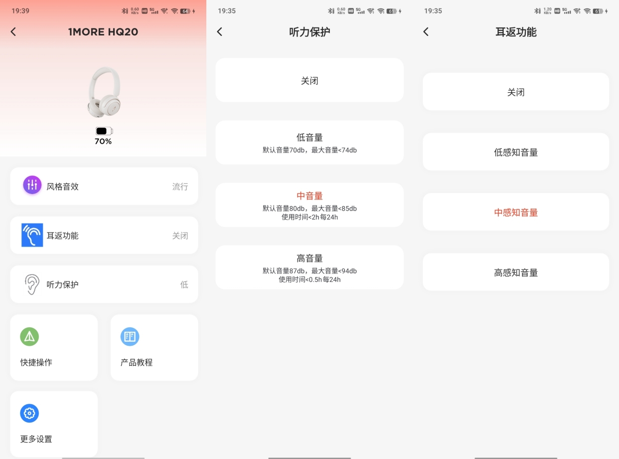 HQ20耳机的最大亮点在于其智能化的听力保护功能。它搭载了HEALTH MORE智能听力保护系统,能够根据用户的听力状况和使用环境自动调节音量,避免长时间高音量使用对听力造成损伤。它有低/中/高三档智能音量,除了这三档可供选择外,它还有危害听力自动降档功能,也就是根据听音时长、音量等听力危害因素自动调节。