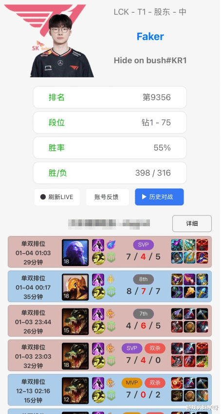 根据韩服排位统计,小程序显示,Faker在结束长达30天的行程后,终于登录韩服账号,连打四把排位,战绩1胜3负便迅速下线,这个画面本身就极具象征意义——并非状态崩塌,而是疲惫真实存在,长时间脱离系统训练,再加上频繁出差、作息不规律,即便是Faker,也难以做到“随时在线”。