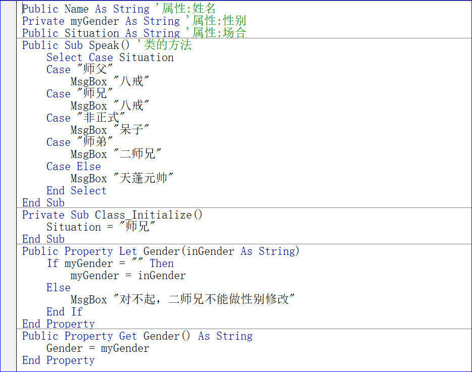 作为VBA开发人员,要深入的领会这种属性设置的意义,比如,如果在类中,将Public Property Get去掉,只保留Public Property Let会怎么样?或者反过来,将Public Property Let去掉,只保留Public Property Get又会怎么样?同时我们要注意严谨性,上述文章中提到的“只写一次属性”,但是如果你第一次将性别赋值为空字符串“”,那么你第二次还能再赋值。如果要设计一个真正的“只写一次属性”,你该怎么做?这些问题都是值得我们思考的。