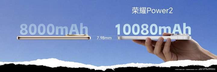新一代荣耀Power2搭载行业最大10080mAh第四代青海湖电池,相比上一代增加高达2080mAh,续航表现再度突破行业极限,并在TÜV莱茵实验室的标准综合场景续航测试中斩获最长续航手机的佳绩。同时,通过将电池硅含量提升至15%,实现行业领先的926Wh/L能量密度,荣耀Power2将机身厚度精准控制在7.98mm,做到了让续航体验跨越式升级的同时,依然保持和上一代相同的超薄机身。