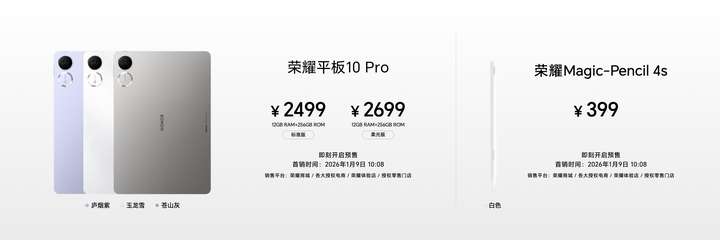 荣耀平板10 Pro于1月9日10:08全渠道正式开售,12GB+256GB标准版售价2499元、12GB+256GB柔光版售价2699元,全新手写笔荣耀Magic-Pencil 4s售价399元;此次将所有配置都升级为新春礼盒套装,12GB+256GB礼盒版现价2499元,12GB+256GB柔光礼盒版现价2699元,购买即赠荣耀Magic-Pencil 4s手写笔;荣耀平板X10 Pro于1月9日10:08全渠道正式开售,8GB+128GB版本售价1499元、8GB+256GB版本售价1699元、8GB+256GB柔光版售价1899元。