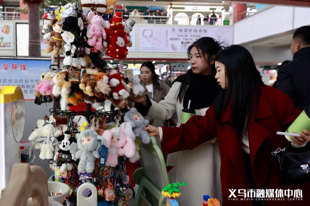 这股开年热力也在义乌全球数贸中心涌动。在潮玩区块的中庭,一个身穿深棕色小熊服饰的卡通玩偶吸引游客纷纷拍照打卡。“这是我们自主设计的IP形象Aoki。”TANG.Toys经营户黄子轩介绍,他们以快闪店形式首次推出Aoki吊卡和“姜姜好”毛绒盲盒两款新品,这也是该品牌首次尝试大批量生产。