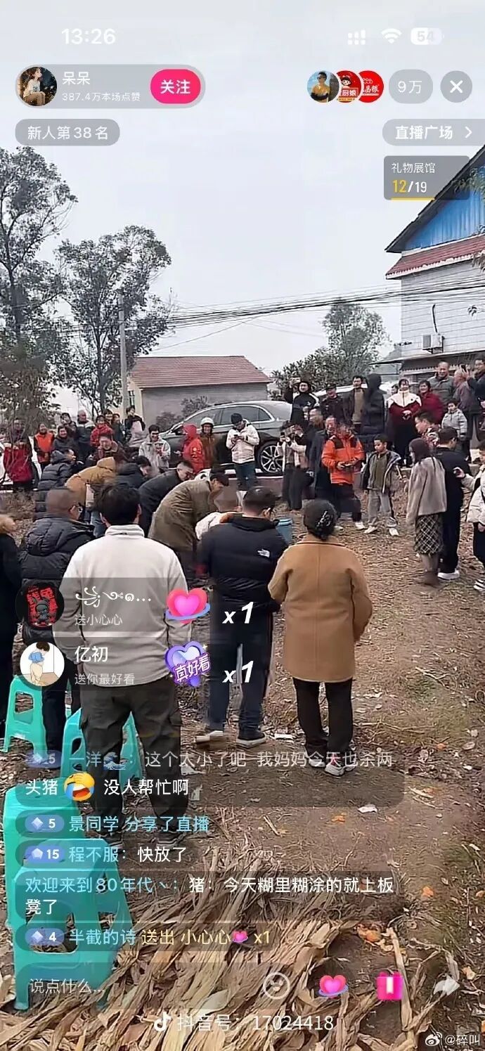 1月9日,博主“呆呆”担忧父亲无力制伏两头年猪,在抖音发布调侃式求助:“帮忙按猪管刨猪汤,最好家门口停满车让我扬眉吐气”。视频24小时内获44万点赞、27万转发,6个500人微信群爆满,超3000人报名。1月11日,上千网友涌入重庆合川庆福村,车辆绵延3-5公里致村道瘫痪,直播间峰值达17.9万人围观。