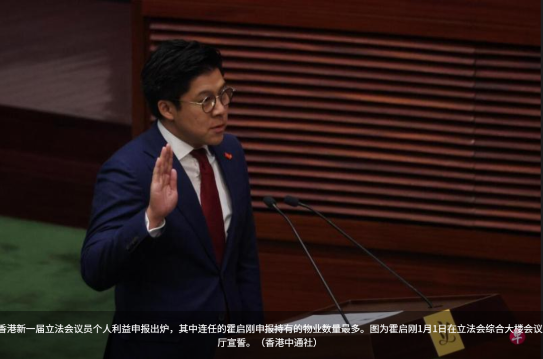 综合《香港商报》与《明报》报道,90名新一届立法会议员的个人利益申报表已上载至立法会网页,不少议员在中国大陆和海外都持有物业。霍启刚申报资料显示,他持有的35项物业中,七处是自用,其余28处出租。其中,香港的物业有22个,中国大陆有四处、澳门共有七处,其中四个是商业单位,另两处分别在法国与英国。