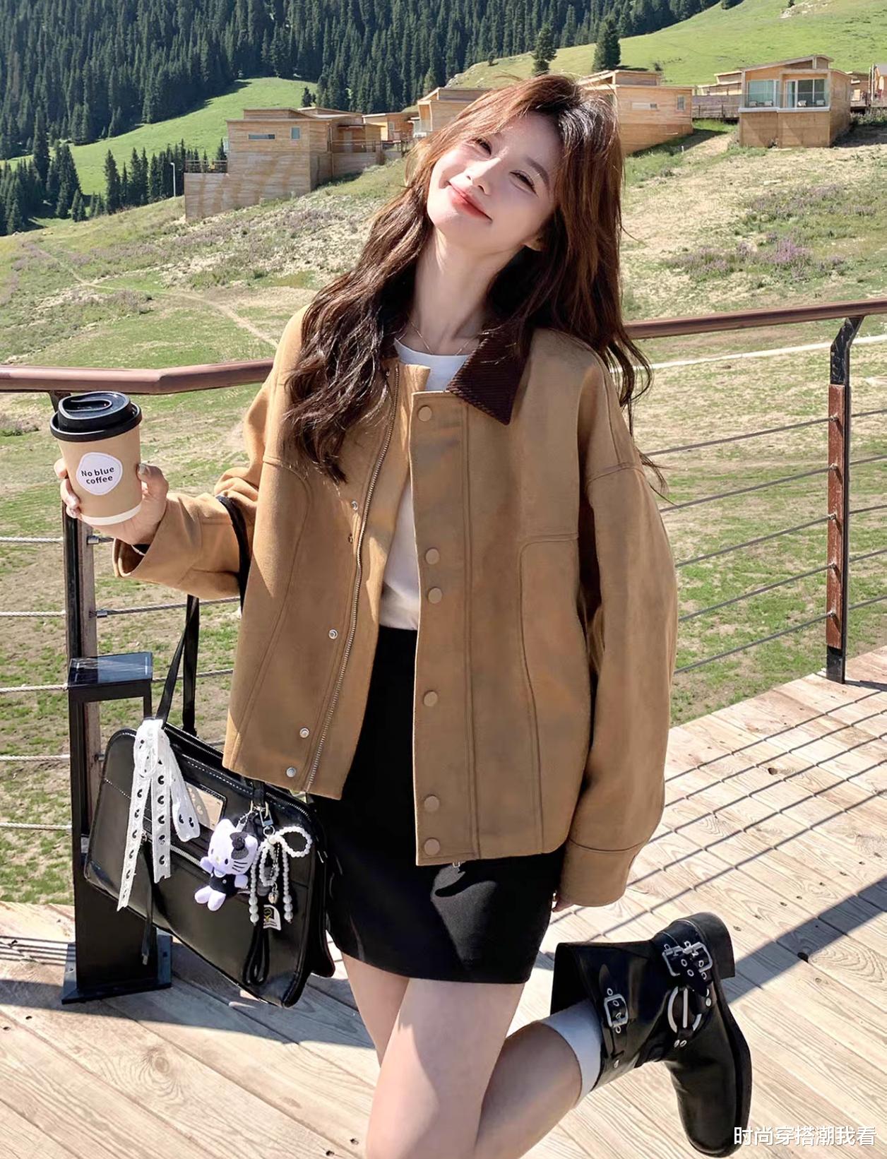 当外面穿着宽松的短款外套时,内搭要选择修身款式,这样才能避免臃肿感。比如咖色的面包棉服,里面可以搭配修身的黑色针织衫,既显瘦又带有高级感。