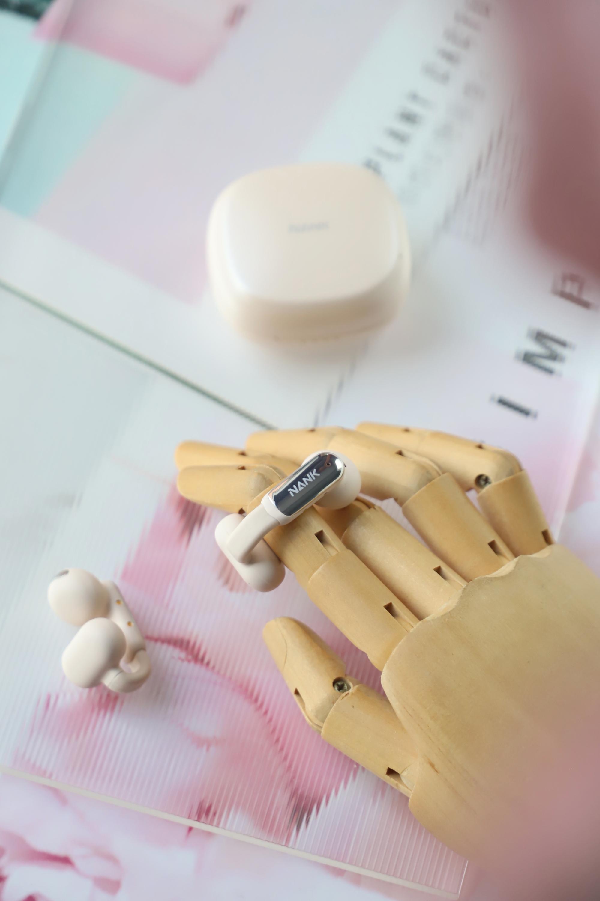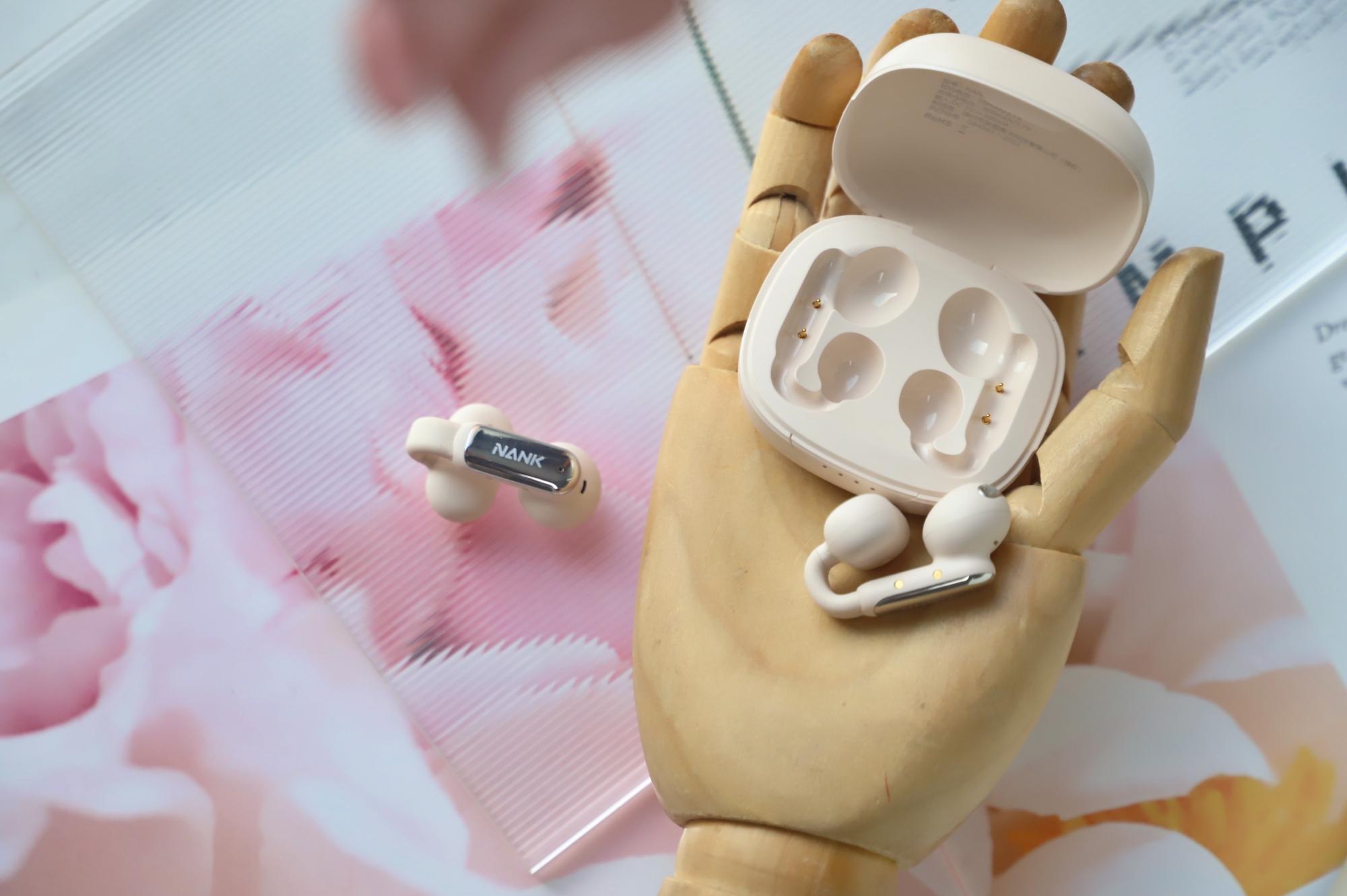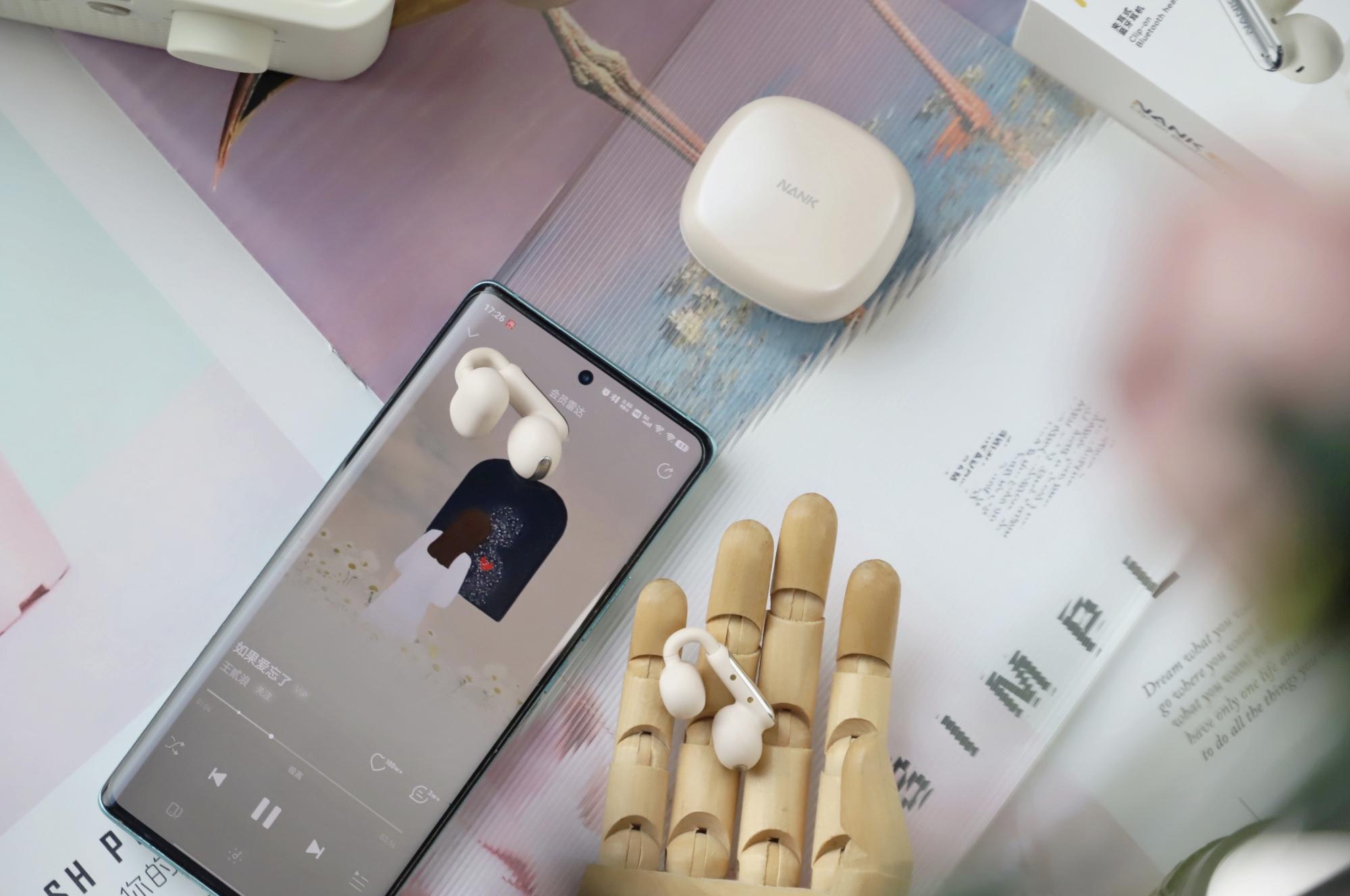 耳挂外圈泛着金属光泽的NANK标识也让耳机犹如一件精美的耳饰,颇有些时尚潮流的点缀。而BUF环扣人体工学设计和航空级弹性材质让耳机质感更加柔软,更是确保了耳机能够紧密贴合各种耳型,无论是跑步、跳跃还是进行其他剧烈运动,耳机都能稳稳地固定在耳朵上,狂甩不掉。