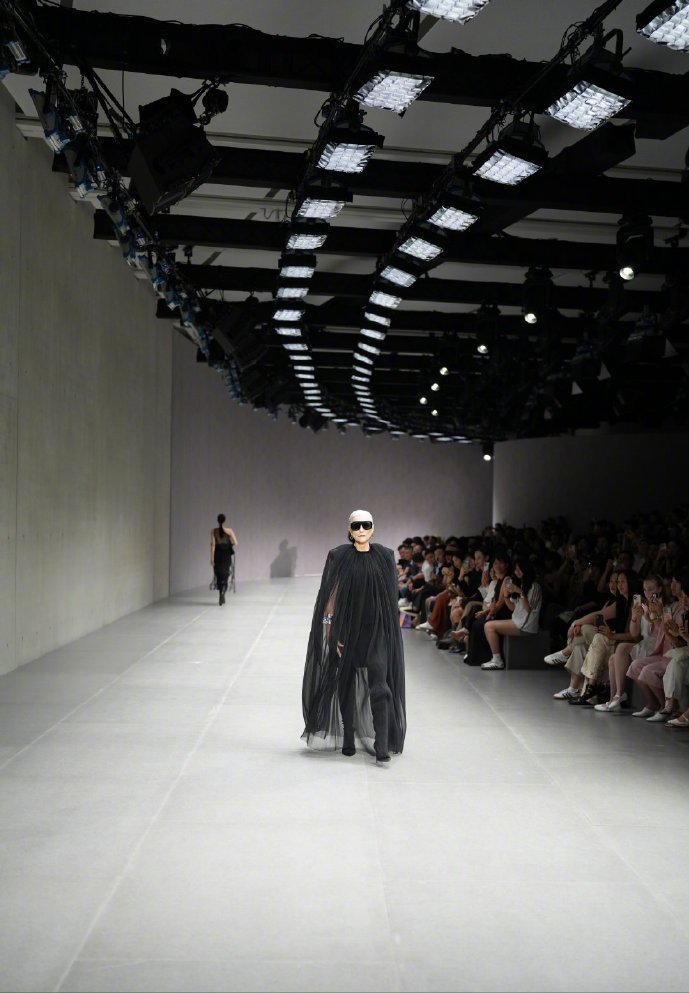 梅耶一袭飘逸的黑色薄纱斗篷惊艳亮相,轻盈的材质勾勒出她优雅的身形。