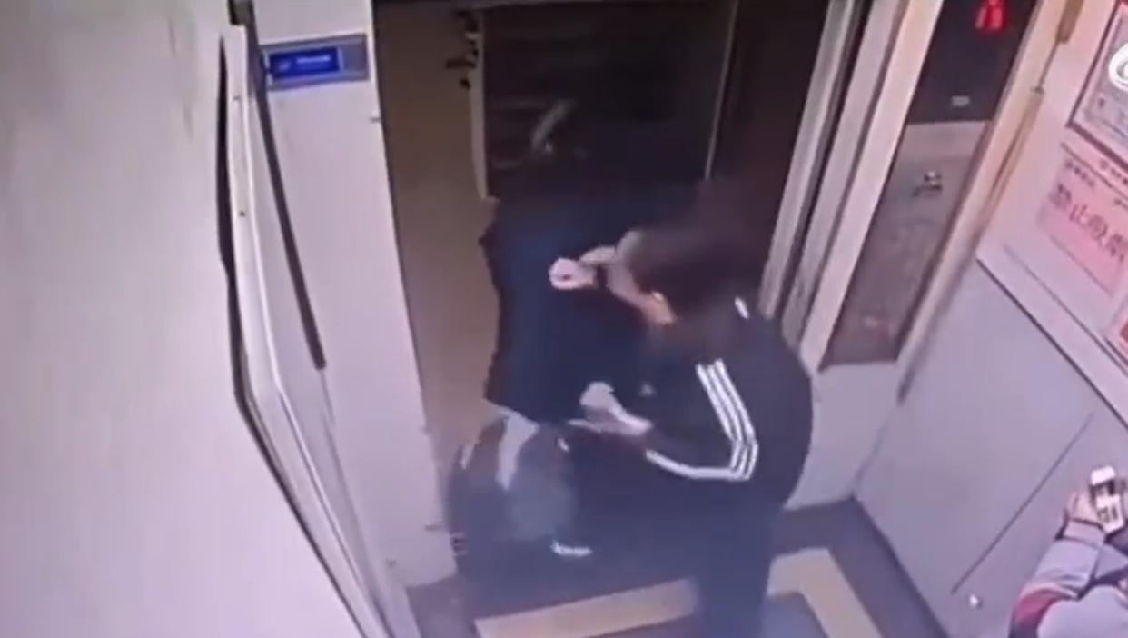 黑衣女子被推出去后,她立刻转身回到电梯,使出全身力气,拳头直直朝这位母亲的脸部打来。
