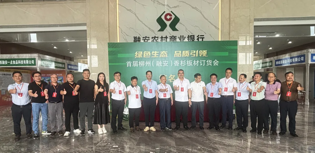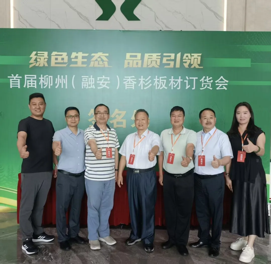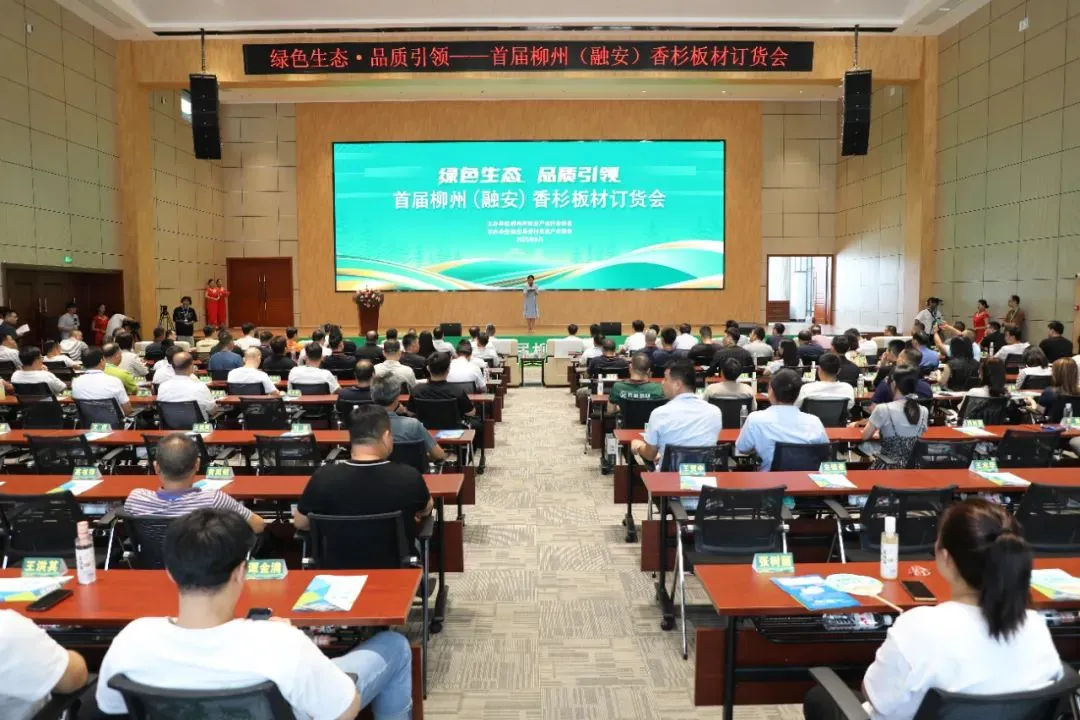 6月29日,首届柳州(融安)香杉板材订货会在广西融安县启幕。来自全国9省(自治区)20多个地级市的行业专家、企业代表齐聚“中国香杉板材之乡”“中国香杉木生态板之都”,共探绿色家居新机遇,现场签约金额达5.76亿元。柳州市人民政府党组成员袁东升,融安县委书记于福坚,自治区林业局世界林木业邀商邀展组副组长曾昭意,广西林业产业行业协会会长万业靖,柳州市林业和园林局副局长欧日升,融安县委常委、副县长莫慧明,副县长陈远昭等出席活动。2025年广西国际林产品及木制品展组委会参加活动并宣传展会。