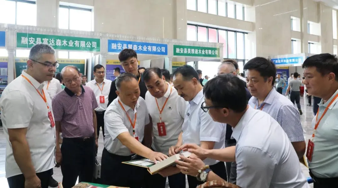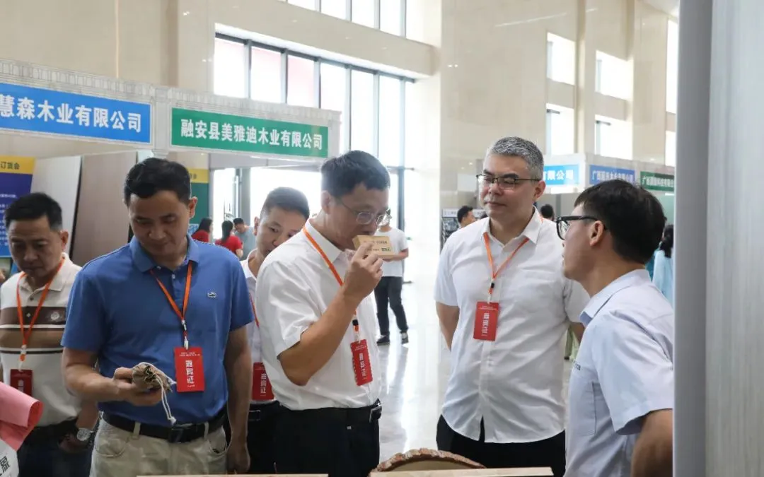 6月29日,在首届柳州(融安)香杉板材订货会现场,柳州市人民政府党组成员袁东升(中)参观展厅。