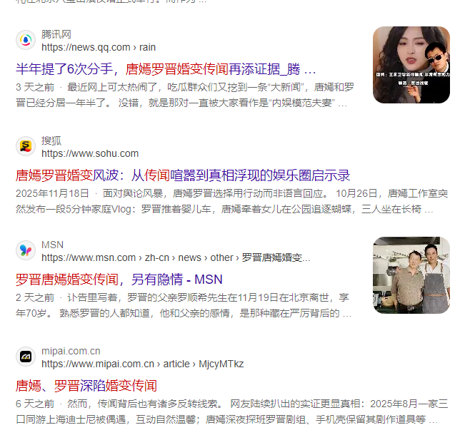 这场婚变传闻,其实来得挺突然。11 月中旬,有网友匿名爆料 “某中年明星夫妻秘密离婚”,没说名字,但因为唐嫣和罗晋这两年公开同框越来越少,社交平台上也没什么互动,一下子就被推到了风口浪尖。接着就有营销号扒各种 “证据”:说他们 2025 年互相没发生日祝福,跟早年动不动晒合照的甜蜜样子差太远;查天眼查发现两人名下公司没关联,就猜是 “提前分财产”;甚至翻出两人 2023 年同城时间不到 10 天,断言 “早就分居了,婚姻名存实亡”。
