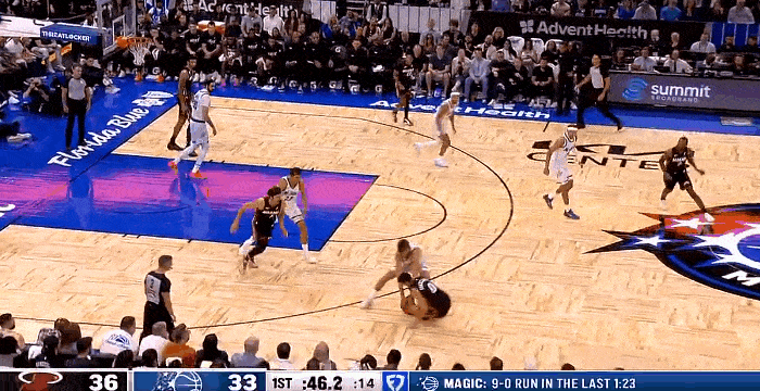NBA常规赛,热火对阵魔术的比赛正在进行中。第一节比赛中,瓦格纳抢断助飞布莱克空接飞扣,魔术又轰出一波11-0追至1分。