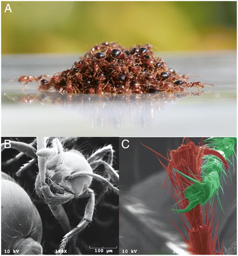 要构成一个足以活命的“蚁船”,就需要由几百只红火蚁组成。它们有的用下颌咬住旁边蚂蚁的腿,有的是用腿勾住其他蚂蚁的腿,腿上的黏合垫增强了拉力。