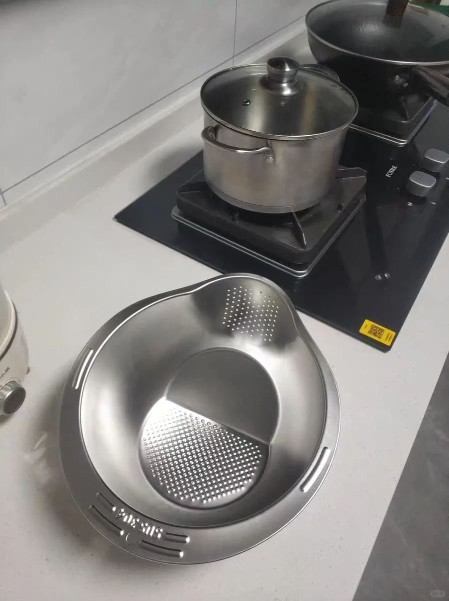 而且这个盆自身非常好清洁,全身都是304不锈钢,食品级材质,无毒无害,完全不沾油,水一冲就立马干净。