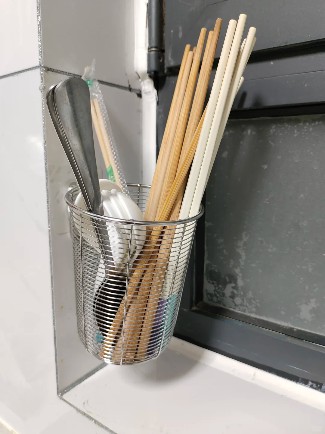 这个不锈钢的筷子筒可以上墙,实现完美的空中收纳,而且方便清洁,更透气,用了它再也不需要担心筷子闷着发霉。