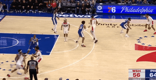 灰熊强侧发动挡拆,费城弱侧大面积回收压缩中路空间,VJ阅读到阿尔达马要出球给弱侧底角后,判断到传球路线,迅速交叉步上前高高跃起抄截传球。
