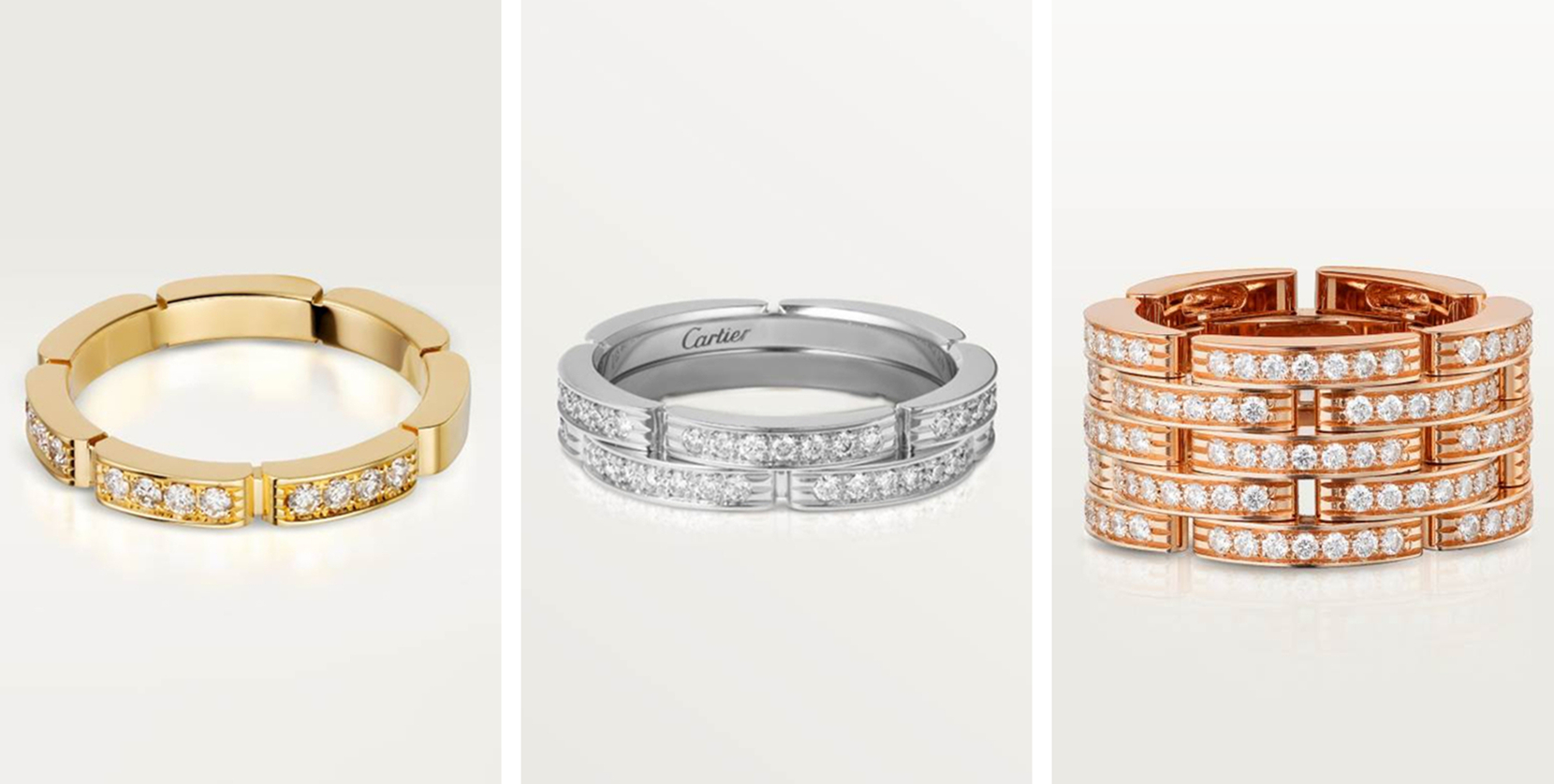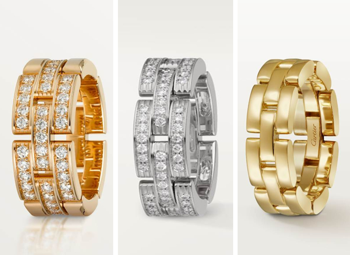 除了本期介绍的白金材质外,同款戒指另配有18K玫瑰金与18K黄金两种颜色,以满足不同的佩戴风格。若您倾心于三排设计,专柜还提供简约大气的无钻款和极致奢华的满钻款,不同配置对应的模块数量也经过精心调整,以确保整体视觉的和谐统一。此外,该系列还设计了单排、双排、五排等不同宽度的样式,其镶钻组合与材质配色更为多样。
