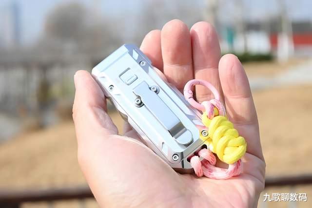 机身底部的手绳孔洞设计的很宽大,可以轻松将粗壮的伞绳穿连。而背部的单向抱夹则是用两枚内六角螺丝固定,可以夹的紧实且不会松动。外出携带时可以挂在腕间或背包上,也可以夹在腰间或背带上,怎么方便怎么来。
